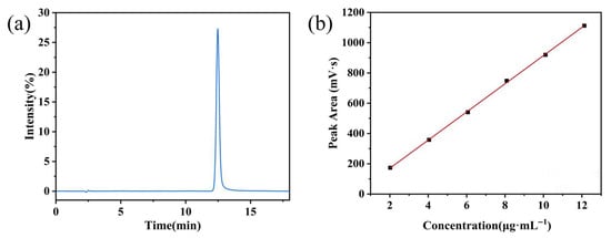 As shown in Figure 6a and Table 3, the target peak retention time for the curcumin solution was 11.23 min. Figure 6b depicts the linear regression of peak area (A) versus curcumin concentration (C), yielding the regression equation A = 59.801C − 14.76. A good linear relationship (R2 = 0.999) was observed for curcumin within the concentration range of 2.006 to 12.03 µg·mL−1.