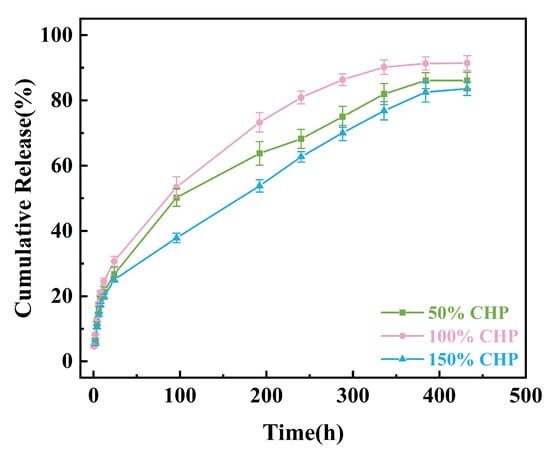 Cumulative release percentage in vitro of 50% CHP, 100% CHP, and 150% CHP.