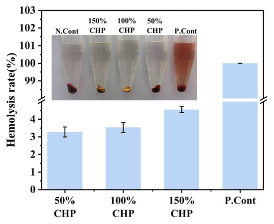 As shown in Figure 8, the solution in the positive control group (pure water) appeared clear red. Due to the osmotic pressure of pure water being lower than that of red blood cells (RBCs), the RBCs absorbed excess water and underwent rupture, resulting in hemolysis. In contrast, solutions containing different concentrations of CHP exhibited RBC sedimentation with clear, transparent supernatant. Furthermore, the hemolysis rates for all CHP groups were less than 5%, complying with pharmacopoeial requirements and indicating negligible hemolysis. These results demonstrate the favorable biocompatibility of the CHP micron-scale coating.