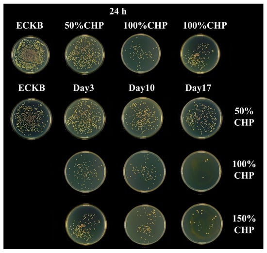 Bacterial colony counts on 50% CHP-Ti-MAO, 100% CHP-Ti-MAO, and 150% CHP-Ti-MAO samples at 24 h on day 3, day 10, and day 17.