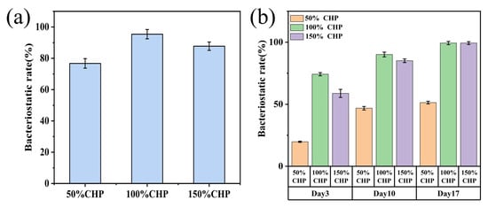 Antibacterial rates of CHP-Ti-MAO samples: (a) 50% CHP-Ti-MAO, 100% CHP-Ti-MAO, and 150% CHP-Ti-MAO at 24 h; (b) corresponding samples at day 3, day 10, and day 17.