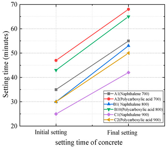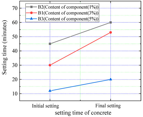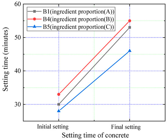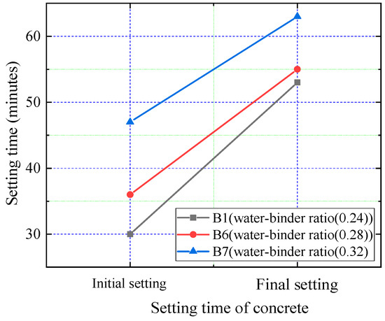 When the total amount of cementitious materials is fixed at 800 kg/m3, the water-reducing component is naphthalene water-reducing agent and the content is 2%, and the content of the quick-setting and early-strength component is 3%, the effects of water–binder ratio of 0.24, 0.28, and 0.32 on the setting time of fresh concrete are compared, as shown in the Figure 5.