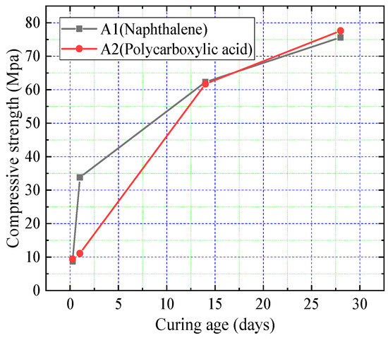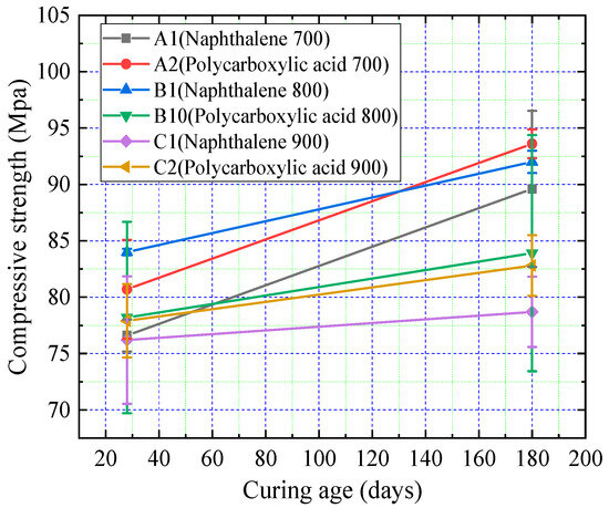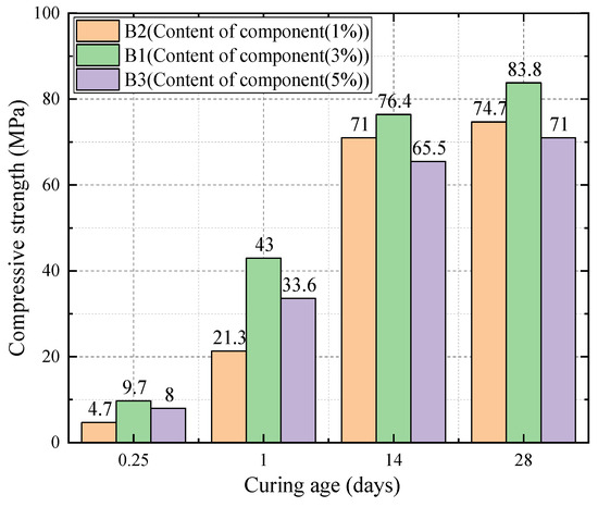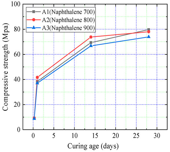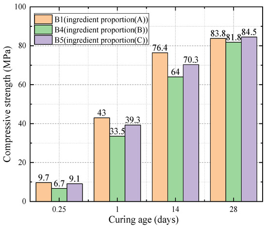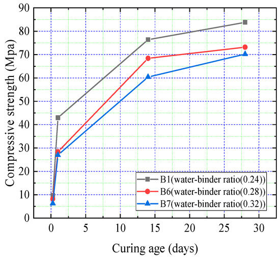 Table 6 is used to change the total amount of cementitious materials (700 kg/m3, 800 kg/m3, and 900 kg/m3), fix other parameters (water–binder ratio 0.24, super-early-strength agent type and dosage), and explore the effect of the amount of cementitious materials.