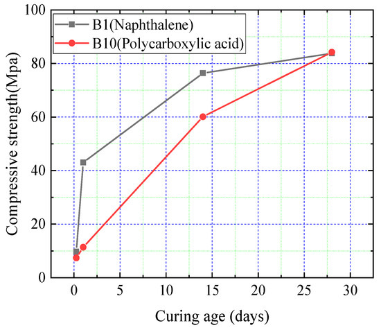 - High-strength concrete can be prepared by using 42.5R ordinary Portland cement and adding a super-early-strength agent. The optimum ratio is as follows: the total amount of cementitious material is 800 kg/m3 (including 10% silica fume), the water–binder ratio is 0.24, the content of quick-setting early-strength component A is 3%, and the content of naphthalene water-reducing component is 2%. The compressive strength of the prepared concrete was the highest at 6 h, 1 day, and 28 days. The compressive strength of 28 days reached 80 MPa, and the compressive strength of 180 days did not shrink and showed a slow growth trend.