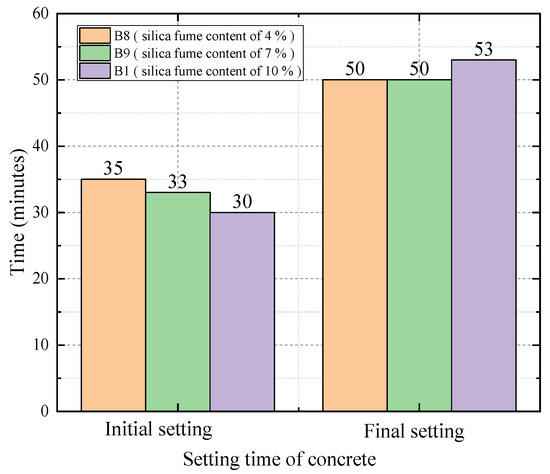 It can be seen from Figure 17 that the setting time of concrete is not significantly different when the silica fume content is 4%, 7%, and 10%.