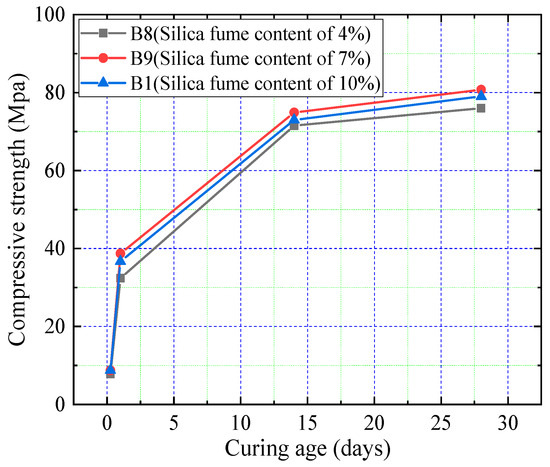Figure 18 shows that when the content of silica fume is less than 10%, the compressive strength of concrete at each age increases with the increase in silica fume content, and the compressive strength is the highest when the content of silica fume is 10%. Therefore, combined with the influence of silica fume content on the initial and final setting time, the best silica fume content is 10% in this experiment.