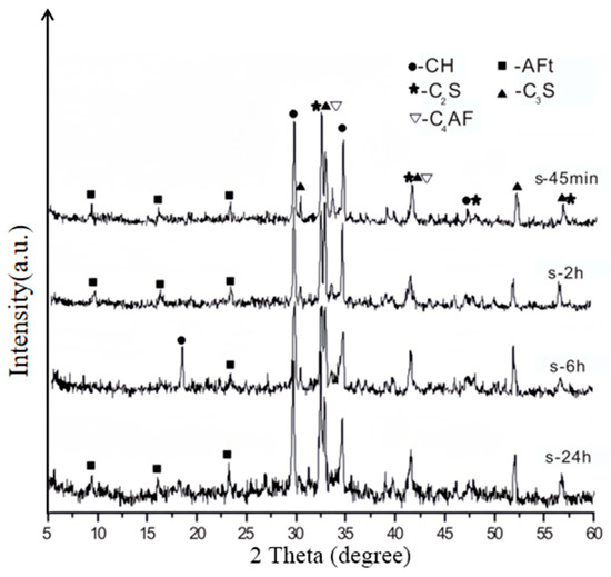 In addition, the hydration age of the sample at 2 h and 6 h has an obvious endothermic peak at about 440 °C in the DSC curve. There is Ca(OH)2 in the hydration sample, but it is not obvious at 45 min and 24 h. In the hydration age of 2 h and 6 h, ettringite and Ca(OH)2 are quickly generated due to the incorporation of self-made super-early-strength agent, especially when the hydration of 6 h Ca(OH)2 is generated in large quantities, which is also consistent with the XRD analysis results. Therefore, the incorporation of self-made super-early-strength has a significant effect on accelerating the early hydration of cement.