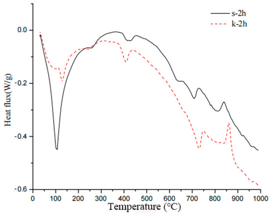 TG-DSC analysis: STA449 type synchronous thermal analyzer produced by the Netzsch company(Selb, Germany) was used to test the TG-DSC variation characteristics of hydration samples from room temperature to 1000 °C in an argon atmosphere. The flow rate was 20 mL·min−1. The heating rate was 10 °C·min−1, and the amount of sample was about 10 mg, Al2O3 crucible.