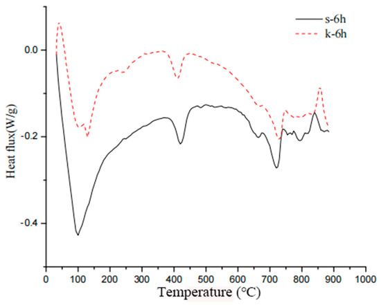 It can be seen from Figure 24, Figure 25 and Figure 26 that the endothermic effect of the group S samples at about 120 °C is much larger than that of the group K samples. The addition of super-early-strength agent significantly promotes the formation of hydration products such as ettringite and accelerates cement hydration. At the same time, at the temperature of 440 °C, the endothermic effect of the S group sample is much smaller than that of the K group sample. When the hydration age is 6 h to 24 h, the addition of the super-early-strength agent consumes Ca2+ and converts to ettringite, which greatly reduces the amount of Ca(OH)2 and increases the amount of ettringite. Therefore, the endothermic effect is that the endothermic peak at 120 °C is obvious at 24 h of hydration and there is no endothermic peak at 440 °C, which is consistent with the XRD analysis results.