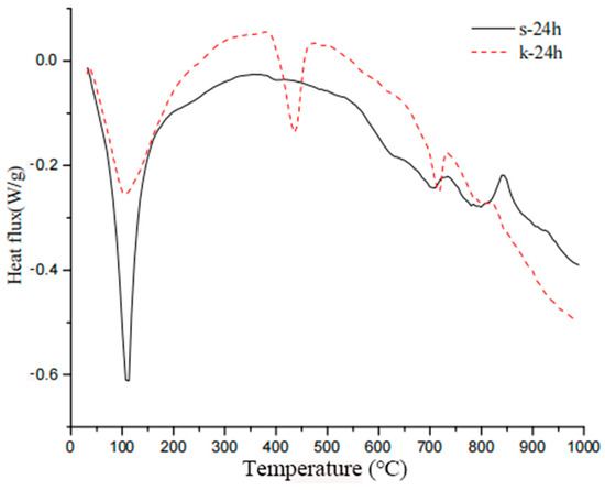 It can be seen from Figure 23 that the samples in group S have different endothermic peaks at about 120 °C, and the endothermic effect is the most obvious in 24 h. According to the relevant spectra, the peak generated by this endothermic effect is actually the removal of the two weakest molecular waters in the ettringite structure of the sample. Therefore, the size of this endothermic effect also indirectly reflects the amount of ettringite formation. This is consistent with the results of XRD analysis.