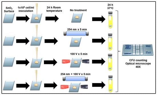 Schematic representation of the antimicrobial assay methodology for SnO2 thin films exposed to UVC irradiation and electric current against the human pathogen C.albicans. Experiments were performed in triplicate, and the inhibition percentage was calculated relative to an inoculated glass surface used as the viability control.