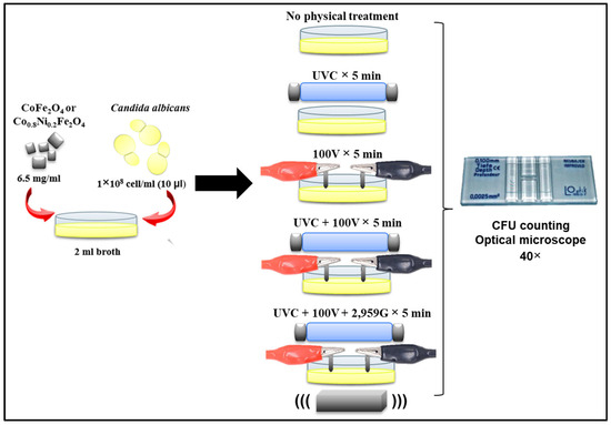 Schematic representation of the antimicrobial assay methodology for CoFe2O4 and Co0.8Ni0.2Fe2O4 nanoparticles against Candida albicans, under exposure to UVC irradiation, electric current, and magnetic fields.