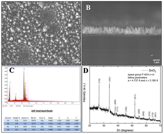SEM analysis of the SnO2 film showing: (A) surface topography and (B) cross-sectional thickness. (C) EDS analysis confirmed the elemental composition of the film, while XRD analysis (D) Identified the tetragonal cassiterite phase as the dominant crystalline structure.