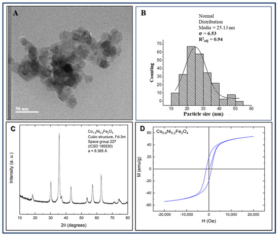 Characterization of Co0.8Ni0.2Fe2O4 nanoparticles, comprising: (A) TEM micrograph displaying particle morphology, (B) particle size distribution, with an average diameter of 25.13 nm, (C) XRD pattern similar to the undoped particles, (D) magnetic properties demonstrated through the initial magnetization curve and hysteresis loop.