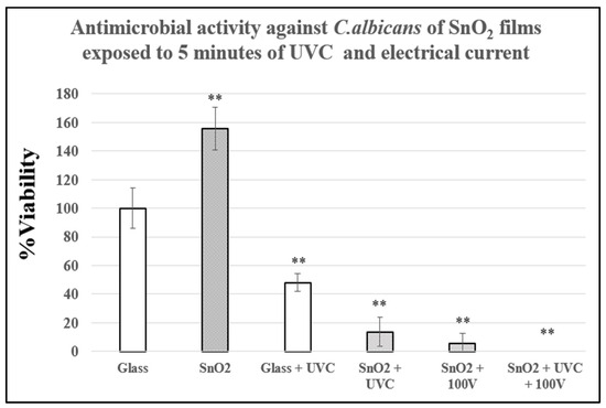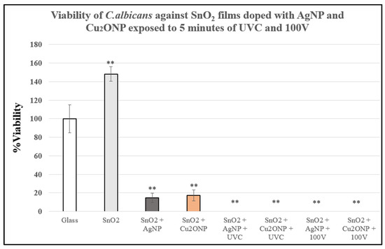C. albicans viability assay following exposure to UVC irradiation and 100 V on SnO2 film surfaces, with or without Cu2O and Ag nanoparticles. Inert glass surfaces were used as negative controls. Asterisks indicate statistically significant differences (p < 0.01).