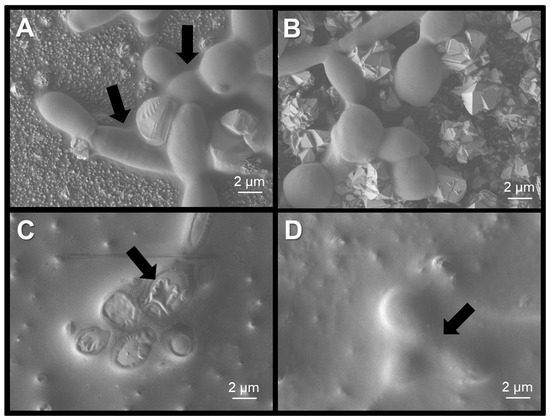 SEM analysis of SnO2 films inoculated with C. albicans. (A) Presence of biofilm (indicated by black arrows) surrounding yeast cells on the surface of undoped SnO2 films. (B) Biofilms are no longer visible following UVC exposure. (C) On SnO2 films doped with AgNPs, damage to the cell wall is observed in most yeast cells (indicated by black arrow). (D) SnO2 films doped with Cu2O nanoparticles show extensive biofilm coverage.