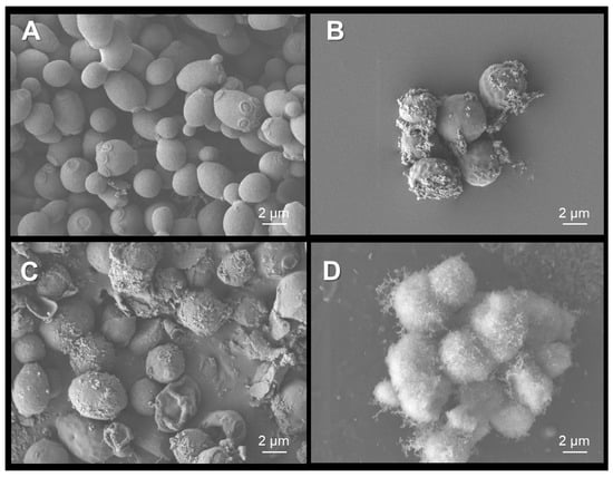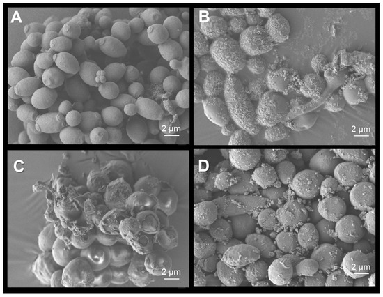 SEM analysis of C. albicans exposed to Co0.8Ni0.2Fe2O4 and physical treatments: (A) Untreated control, (B) exposure to cobalt–nickel ferrites, (C) cobalt–nickel ferrites and UVC radiation, (D) cobalt–nickel ferrites combined with UVC radiation, electrical current, and magnetic field.