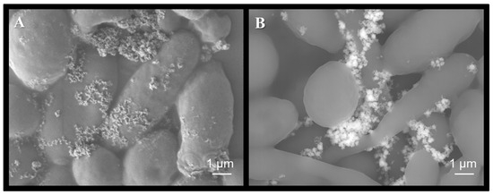 The accumulation of CoFe2O4 and Co0.8Ni0.2Fe2O4 nanoparticles was confirmed using backscattered electron imaging, which allows contrast based on atomic number. This technique was used to differentiate the nanoparticles from organic matter, which can appear similar in conventional micrographs (Figure 11A). The bright (white) structures observed in Figure 11B correspond to heavier elements (indicative of the nanoparticles) while the surrounding organic cellular components appear in varying shades of gray.