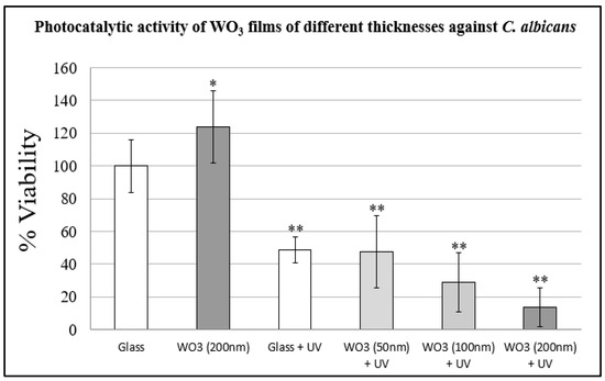 Viability assay of C. albicans exposed to UVC radiation (254 nm) for 5 min after inoculation on glass (control) and WO3-coated surfaces. Film thickness significantly influenced fungal inhibition, with 200 nm WO3 films demonstrating the highest efficacy. p < 0.05 (*), p < 0.01 (**).