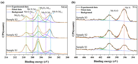 XPS pattern of different NbNx coatings: (a) Nb 3d, (b) N 1s.