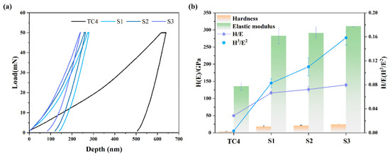 The stability and long-term application of fuel cells are closely related to the wear and corrosion of the bipolar plate surface. Corrosion products and solid particles generated by the long-term reaction between the electrolyte and the bipolar plate can cause surface scratches and wear [30]. Hardness (H) is an essential indicator for evaluating the wear resistance of coatings [31]; in general, samples with higher hardness values have higher wear resistance. Figure 4 shows the nanoindentation results for the substrate and coatings. The hardness values of TC4 and Samples S1, S2, S3 are 3.89, 18.79, 21.05 and 24.85 GPa, respectively, and the elastic modulus (E) values are 135.59, 283.05, 291.08 and 311.25 GPa, respectively. The hardness values of Samples S1, S2 and S3 increased by 3.8, 4.4 and 5.4 times compared to the TC4 alloy. It can be observed that the hardness of the coatings increased with the increase in nitrogen content, and Sample S3 had the highest hardness value. The H/E value has typically been regarded as an indicator of fracture toughness in previous research [32], with higher values indicating greater toughness. The H3/E2 value can indicate load-bearing capacity, with coatings having higher values capable of withstanding greater loads. Therefore, we can infer that samples with high H/E and H3/E2 values exhibit superior wear resistance. As shown in Figure 4b, the H/E values of TC4 and the Samples S1, S2, S3 were 0.0287, 0.0664, 0.0723 and 0.0798, respectively, while the H3/E2 values were 0.0032, 0.0828, 0.1100 and 0.1584, respectively. The H/E and H3/E2 values of the coatings increased with increasing nitrogen content, and Sample S3 with δ′-NbN phase had the highest value, indicating that S3 has the best load-bearing capacity and wear resistance. This results in fewer diffusion channels (e.g., wear pits, scratches) for corrosive ions and extends the service life of the bipolar plate.