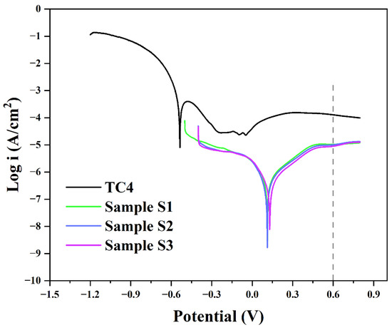 The surface morphology after the polarization test also showed the same results, as shown in the Figure 7. A clear break-up of the passivation film can be observed in the SEM morphology of the TC4 substrate, which is probably attributable to the corrosive dissolution of the TiO2 film in the acidic solution [34,36]. In addition, no obvious corrosion signs such as coating flaking or corrosion pits were found on any of the coating surfaces, which indicates that all the NbNx coatings, especially Sample S3, had better stability and corrosion resistance compared with the Ti substrate.