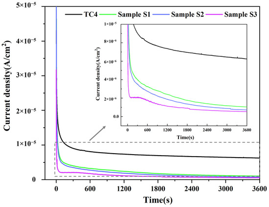 To assess the durability of different NbNx coatings in operational conditions, potentiostatic polarization tests were carried out for 1 h in a simulated PEMFC cathode environment (+0.6 V, 70 °C). The polarization curve is shown in Figure 6. Initially, the current density of all samples decreased sharply during the test, potentially attributed to the development of a passivation layer on the NbNx coating’s surface, and then was maintained at a relatively stable value [16]. At the end of the test, the current densities of TC4 and Samples S1, S2, and S3 were 6.2, 1.04, 0.72 and 0.54 μA/cm2, respectively. Sample S3 exhibited the lowest corrosion current density of all the coatings, indicating excellent passivation performance, enhanced corrosion protection and satisfaction of the U.S. DOE requirement (icorr < 1.0 μA/cm2).