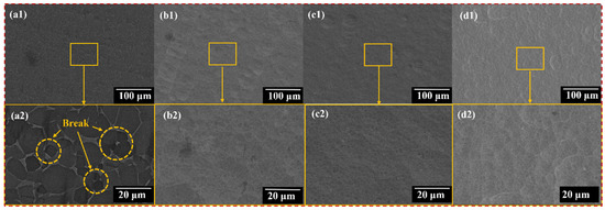 SEM surface images of (a1,a2) TC4 and Samples (b1,b2) S1, (c1,c2) S2, (d1,d2) and S3 after potentiostatic polarization tests.