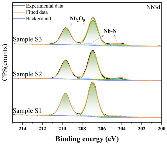 Figure 2 shows the XPS patterns of different NbNx coatings. Figure 2a shows the fitting results for the Nb 3d peak. The peaks at 204.9 eV and 207.7 eV are considered to be Nb-N peaks [21]. The peaks at 203.9 eV and 206.7 eV are Nb-O peaks, and the peaks at 206.6 eV and 209.3 eV are Nb2O5 peaks. This is the result of partial oxidation of the NbN coating when exposed to air [19]. For the N1s peaks, the NbN peak at 396.3 eV and the NbNO peak at 399.8 eV can be observed [25]. This could be relevant to the presence of molecular nitrogen. Niobium oxynitride may be the phase located between the outermost Nb2O5 layer and the intact NbN thin film. As the N2/Ar ratio increases, the peak corresponding to NbN is enhanced. However, it is difficult to distinguish the specific NbN phase, and further analysis using XRD or other tests is required.