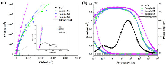 Figure 9 shows Nyquist and Bode plots for the TC4 substrate and the NbNx coatings under different N2 partial pressures. From the Nyquist curves (Figure 9a), all the NbNx coatings have significantly larger capacitive semicircle diameters than the titanium substrate, with the largest radius in Sample S3, indicating a larger capacitive reactance [37], and the TC4 alloy has two obvious capacitive loops (as seen in the local enlarged view). The frequency–phase angle plots (Figure 9b) reveal a plateau across a broad frequency range with a phase angle approaching 90 °, which indicates that all the NbNx coatings have higher chemical stability [38]. In the frequency–|Z| curves (Figure 9b), the values of the impedance modulus at a frequency of 10−2 are in the following order: Sample S3 > S2 > S1 > bare Ti substrate, which indicates that S3 has superior corrosion resistance [39]. Additionally, the Bode plots revealed a single time constant for the NbNx coatings, for which an equivalent circuit with one time constant was employed for simulating the EIS data (Figure 10b). In contrast, the titanium alloy substrate exhibited two distinct time constants (Figure 10a). The values for the fitted circuit elements are presented in Table 3. In the circuit model, Rs signifies the solution resistance, and Rp represents the resistance of the outer fractured passivation film, which was primarily affected by the continuous corrosion of the passivation film on the titanium alloy during the EIS test. The constant-phase element (CPE), related to the double-layer capacitance, serves as a replacement for pure capacitance owing to the inhomogeneity of the electrode surface [40], and the impedance of CPE can be mathematically expressed as