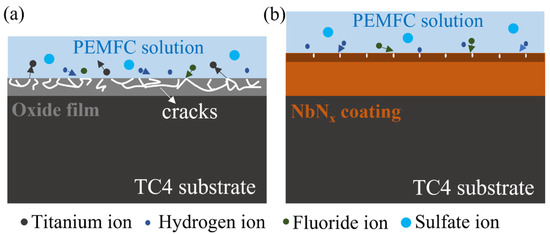 Schematic diagram of corrosion mechanism of (a) TC4 alloy and (b) NbNx coatings.