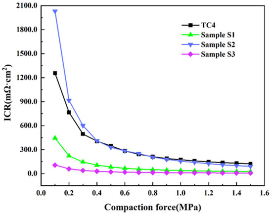 The interfacial contact resistance between the bipolar plate and gas diffusion layer is of great importance in maintaining the high performance of PEMFCs. The ICR values of the TC4 alloy and NbNx coatings were measured as shown in Figure 12. The ICR values of the NbNx coatings and the substrate followed the same trend, which quickly decreased and gradually stabilized at a value with the increase in pressure. This is mainly because of the larger effective contact area between the carbon paper and the tested samples during the test process [44]. It is common for PEMFC stacks to be assembled with a force of about 1.5 MPa, at which the ICR value of the Ti substrate was 122.34 mΩ·cm2, and the value of Sample S1, S2, and S3 was 24.93, 90.69 and 7.29 mΩ·cm2, respectively. Compared with the TC4 substrate, the ICR values of Samples S1, S2 and S3 decreased by 79.62%, 25.87% and 94.04%, respectively. The higher ICR values for titanium alloys than for NbNx coatings are mainly due to the formation of a surface oxide film [45]. The phase of S2 is a mixture of β-Nb2N and δ′-NbN, which reduces the electron conduction efficiency of the coating, so the ICR value is relatively low, while S1 and S3 have more similar and lower ICR values. Sample S3 satisfies the DOE’s target value (< 10 mΩ·cm2) at the compaction force of 1.5 MPa, which indicates that the coating enhances the electrical conductivity of the bare Ti substrate.