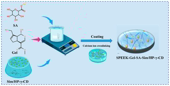 A hydrogel matrix was prepared by dissolving 10 wt% Gel and varying amounts of SA (1, 2, 3, 4, or 5 wt%) in the Sim/HP-γ-CD solution (Figure 2). The mixture was stirred in a water bath at 50 °C for 12 h to ensure homogeneity, followed by ultrasonication to remove air bubbles. The resulting Gel-SA-Sim/HP-γ-CD solution was cast either into molds or directly onto the surface of implant substrates (e.g., sulfonated polyetheretherketone, SPEEK), and incubated at −20 °C for 30 min to solidify. Cross-linking was then performed by immersing the hydrogel in 3 wt% calcium chloride solution for 30 min, yielding Gel-SA-Sim/HP-γ-CD composite hydrogels with different formulations or biofunctionalized implant interfaces coated with the hydrogel.