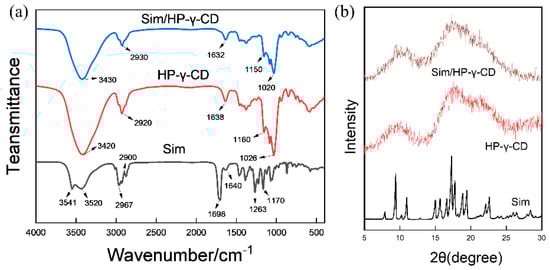 Characterization of the Sim/HP-γ-CD inclusion complexes: (a) the XRD spectra; (b) the FTIR spectra.