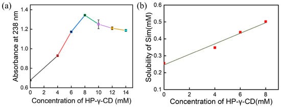 The optimal inclusion ratio between Sim and HP-γ-CD was investigated by preparing Sim/HP-γ-CD inclusion complexes through a saturated aqueous solution method with varying concentrations of HP-γ-CD (0, 4, 6, 8, 10, 12, and 14 mM). Figure 4a demonstrates the changes in Sim absorbance at different HP-γ-CD concentrations. The absorbance indirectly reflects the inclusion efficiency and host–guest binding ratio, where higher absorbance indicates stronger inclusion interactions and improved solubility of Sim. Figure 4a indicates a significant increase in Sim absorbance as the HP-γ-CD concentration rose from 0 to 8 mM, peaking at 8 mM, which suggests the formation of optimal inclusion complexes and maximum efficiency at this concentration. The enhanced absorbance at 8 mM is likely due to the near-stoichiometric 1:1 host–guest ratio, enabling efficient encapsulation of Sim molecules within the cyclodextrin cavity, thereby substantially enhancing the apparent solubility of Sim. Conversely, absorbance decreased with further increases in HP-γ-CD concentration beyond 8 mM, possibly due to competitive cavity binding or aggregation phenomena among excess cyclodextrin molecules. Thus, 8 mM HP-γ-CD was identified as the optimal concentration, maximizing Sim encapsulation efficiency while preventing unnecessary material waste.
