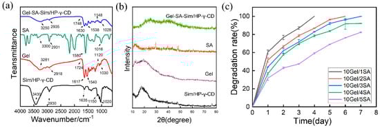 Optimization of the Gel-SA-Sim/HP-γ-CD hydrogel sustained release system: (a) the FTIR spectra and (b) XRD spectra of the Gel-SA-Sim/HP-γ-CD hydrogels; (c) degradation rates of Gel-SA hydrogels with different SA contents.