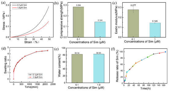 Figure 6a–c present the compressive performance of the Gel-SA-Sim/HP-γ-CD hydrogels. The hydrogel containing 0.1 μM Sim exhibits the higher compressive strength (0.284 MPa) and compressive modulus (0.277 MPa), suggesting stronger load-bearing capacity and greater stiffness, whereas the 1.0 μM Sim hydrogel demonstrates the lower compressive strength and modulus. Generally, higher cross-linking density in hydrogels corresponds to enhanced mechanical properties. The hydrophobicity of Sim reduces the hydrogel’s cross-linking density and significantly affects compressive performance. At 0.1 μM, Sim concentration is low and exerts minimal influence on cross-linking density. Thus, the mechanical behavior is primarily governed by Gel and SA components, resulting in high compressive strength and modulus. However, at 1.0 μM, increased hydrophobicity leads to decreased cross-linking density and diminished mechanical performance. Therefore, 0.1 μM Sim hydrogels are better suited for load-bearing bone tissue repair, whereas 1.0 μM Sim hydrogels may be more applicable as soft tissue scaffolds or drug delivery vehicles.