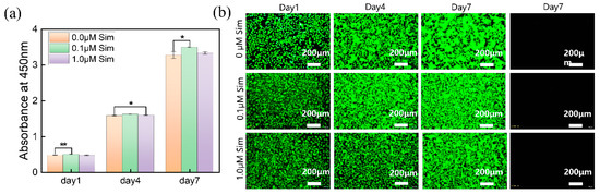 Figure 7b further verifies cell viability through live/dead staining after 7 days of co-culture. All samples support significant cell adhesion, with the majority being live cells (green fluorescence) and negligible cell death (red fluorescence). As culture time increases, cell density rises, with the 0.1 μM Sim group showing the highest density of viable cells. These results confirm that moderate Sim levels (0.1 μM) promote osteoblast proliferation, while higher concentrations (1.0 μM) may be cytotoxic and inhibit growth.