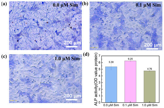 Figure 8 shows the ALP staining results after 14 days of co-culture between MC3T3-E1 cells and the Gel-SA-SIM/HP-γ-CD hydrogels loaded with 0.1 μM and 1.0 μM Sim. ALP activity of the Gel-SA-SIM/HP-γ-CD hydrogel with 0.1 μM Sim increased from 5.39 to 6.25, representing a 15.96% enhancement compared to the control group with 0 μM Sim, which exhibited the strongest enzymatic activity, with dense cellular distribution and intense staining. However, when the Sim concentration was increased to 1.0 μM, ALP activity dropped markedly to 4.76, with reduced cell density and lighter staining, indicating that Sim at 0.1 μM optimally promotes osteogenic differentiation by enhancing ALP activity.