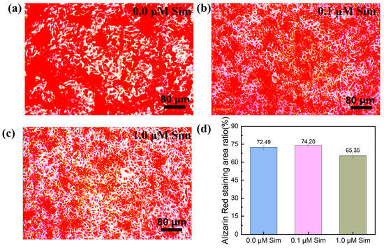 Figure 9 presents the Alizarin red S staining of MC3T3-E1 cells cultured with the Gel-SA-SIM/HP-γ-CD hydrogels for 14 days. The 0.1 μM Sim-loaded hydrogel group demonstrated the most abundant and deeply stained orange-red mineralized nodules, indicating enhanced osteogenic capacity. In contrast, the group with 1.0 μM Sim exhibited fewer mineralized nodules and lighter staining, suggesting an inhibitory effect at higher Sim concentrations.