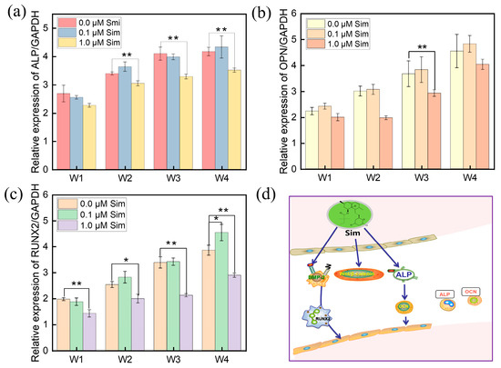 Osteogenic gene expression of MC3T3-E1 cells cultured with the Gel-SA-Sim/HP-γ-CD hydrogels for 1, 2, 3, and 4 weeks: (a) ALP; (b) OPN; (c) RUNX2; (d) diagram of osteogenesis mechanism of Sim, * p < 0.05, ** p < 0.01, n = 3.