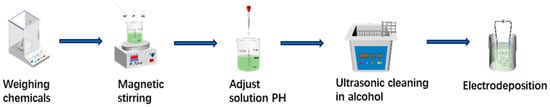 In the field of modern materials science, surface engineering technologies are rapidly advancing. As a key approach to surface modification, composite coatings have attracted extensive attention and have been the subject of in-depth research. Composite coatings prepared by electrodeposition exhibit smooth surface morphology, strong adhesion to various substrates, high hardness, excellent oxidation resistance, and superior corrosion resistance. These properties enable them to demonstrate broad application potential across multiple industrial sectors, including aerospace, automotive manufacturing, and electronic equipment [1,2,3,4,5,6,7].