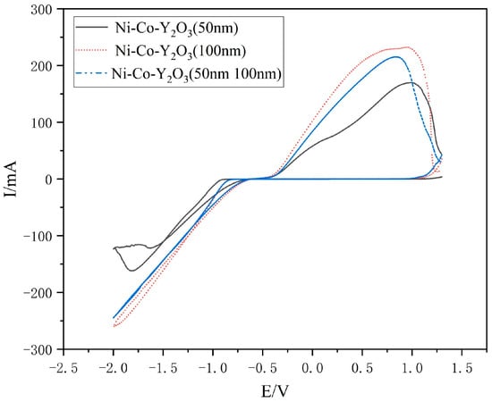 Figure 2 shows the cyclic voltammetry curves of three Ni-Co-Y2O3 composite coatings. The reduction potential of Ni-Co-Y2O3 (50 nm) coating is −0.9 V. The Y2O3 particles with a 50 nm particle size are smaller, reducing the effective reaction area, thereby increasing the resistance of electron transfer, resulting in the reduction reaction requiring a more negative potential to drive. In addition, particle agglomeration restricts the diffusion of reactant ions (Ni2+, Co2+), further increasing reaction resistance. The negative reduction potential (−0.9 V) indicates that the reduction reaction is more difficult and that the deposition process demands higher energy input. In contrast, the reduction potential of the Ni-Co-Y2O3 (100 nm) coating is −0.8 V. The larger Y2O3 particles at this size enhance the effective reaction area and facilitate electron conduction, thereby reducing electron transfer resistance. The increased particle spacing also improves the diffusion of reactants and mitigates diffusion limitations [29].