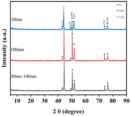 Figure 3 shows the XRD patterns of Ni-Co-Y2O3 composite coatings (50 nm, 100 nm, and 50 nm and 100 nm mixed) prepared by different particle sizes of Y2O3, and analyzes the crystal structure characteristics of the coating. The XRD pattern of the Ni-Co-Y2O3 composite coating was presented by comparing the diffraction peaks of the coating with the standard diffraction peaks compiled by the Joint Committee on Powder Diffraction Standards (JCPDS). The diffraction peaks corresponding to Ni, Co, and Y2O3 could be identified in the composite coating. The XRD pattern reflects the phase composition and crystal structure of the material by measuring the X-ray diffraction intensity at different 2θ angles. There is a weak peak between 40° and 45°, which corresponds to the diffraction peak of Y2O3. Moreover, there are phases formed by Ni and Co in the coating, and Y2O3 particles are successfully compounded. Compared with Ni-Co-Y2O3 (50 nm) coating, the change of Co/Ni peak position and strength may be caused by the change of stress state and crystal growth direction caused by the increase in coating thickness, which also indicates that Y2O3 is successfully compounded.