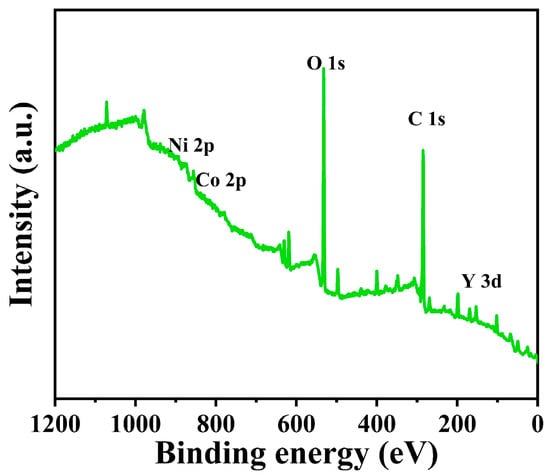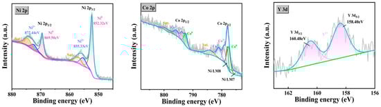 As illustrated in Figure 6, in the Ni 2p spectrum, the Ni 2p3/2 peak is observed at approximately 852.32 eV and 872.44 eV, exhibiting a relatively weak intensity. A peak potentially associated with metallic nickel (Ni0) may be present at lower binding energies, indicating a low content of metallic Ni in the coating. The peak at 869.50 eV is potentially associated with Ni+, indicating that nickel in the coating exhibits multiple oxidation states. In the Co 2p spectrum, the Co 2p3/2 peak is observed at approximately 779 eV and 795 eV, with the peak at 778–780 eV being correlated with Co2+. The broadened peak suggests that cobalt exists in multiple chemical states or distinct crystal structures. During the growth of the coating, Co forms alloys or compounds with Ni and Y, leading to changes in the electronic structure, which are manifested as broad peaks in the XPS spectrum. In the Y 3d spectrum, the Y 3d5/2 peak is located near 158.40 eV and 160.48 eV, corresponding to Y3+ in Y2O3. The mixture of Y2O3 particles with sizes of 50 nm and 100 nm results in the broadening or shifting of the Y binding energy, and the variations in the local chemical environment of Y influence its distribution and chemical state.