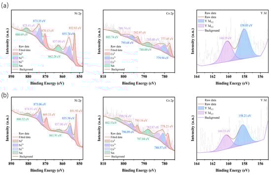 The spectral peak characteristics of Ni, Co, and Y elements in the coatings were systematically investigated and compared. Figure 4 presents the XPS survey spectrum of the composite coating. Figure 5 shows the XPS detection diagrams of the coatings prepared with 50 nm and 100 nm. Table 2 presents the content of each element. In the Ni 2p spectrum, the Ni 2p3/2 peaks for the Ni-Co-Y2O3 (50 nm) coating were observed at 852.83 eV and 873.35 eV, whereas those for the Ni-Co-Y2O3 (100 nm) coating were located at 851.93 eV and 873.06 eV, indicating a shift towards lower binding energy by approximately 0.9 eV. The peak intensity of the Ni-Co-Y2O3 (100 nm) coating is significantly higher, suggesting modifications in the chemical environment of Ni, variations in its relative content, or alterations in surface enrichment. The Co 2p3/2 peaks are observed at 779.94 eV and 795.68 eV in (a), and at 780.57 eV and 796.09 eV in (b). These peaks exhibit a shift towards lower binding energy, accompanied by an increase in peak intensity, which indicates changes in the valence state, content, or surface distribution of Co. The Y 3d5/2 peak is located at 158.03 eV in (a) and shifts to 158.21 eV in (b), corresponding to a shift towards higher binding energy by approximately 0.18 eV. Additionally, the peak intensity is enhanced, implying modifications in the chemical environment of Y, variations in its relative content, or an increase in surface distribution density [30,31].