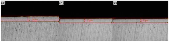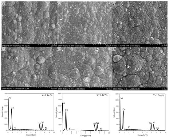 Figure 7 shows the cross-sectional morphology of the coatings prepared with different particle sizes and mixed particle sizes. The thickness of the coating was 38 μm, 32 μm, and 33 μm, respectively. Figure 8 shows the surface morphology of the coatings prepared with different particle sizes and mixed particle sizes. At a magnification of 2000× and 5000×, the Ni-Co-Y2O3 (100 nm) coating exhibits uniformly distributed surface particles with consistent spacing, indicating that the nanoparticles were well dispersed during the deposition process. The EDS spectrum reveals that the coating primarily consists of Ni, Co, and Y elements, with Ni and Co present in higher concentrations and Y in a relatively lower amount. Since EDS cannot distinguish between nanoparticles of different sizes, only the total Y content can be determined. The Y content in the three composite coatings is 1.3 wt%, 1.4 wt%, and 1.7 wt%, respectively. These results demonstrate that during the electroplating process, metal ions and nanoparticles were uniformly deposited onto the substrate surface, and Y2O3 nanoparticles participated stably in the deposition reaction without significant agglomeration or loss.