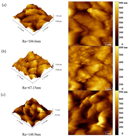 Figure 9 is the AFM image of the composite coating. From the 3D image, the surface of Ni-Co-Y2O3 (50 nm) coating shows more peak–valley structures, and the height difference is relatively large. This may be due to the formation of relatively dense and irregular accumulation of 50 nm particles during the coating process. The surface of Ni-Co-Y2O3 (100 nm) coating is relatively flat, the peak–valley structure is relatively small and the height difference is small. The peak–valley structure on the surface of Ni-Co-Y2O3 (50 nm and 100 nm mixed) coating is very significant, and the height difference is also very large. This may be due to the complex microstructure formed by the mixing of 50 nm and 100 nm particles, and the interaction of particles with different sizes.