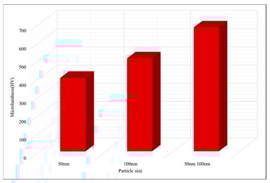 Figure 10 is the hardness analysis histogram. Table 3 presents the hardness measurement data of the composite coating. It can be observed from the chart that the hardness of the Ni-Co-Y2O3 (50 nm and 100 nm mixed) coating is significantly higher than that of the other two coatings. In the Ni-Co-Y2O3 (50 nm) composite coating, the relatively small nanoparticle size leads to a higher proportion of grain boundaries. An excessive number of grain boundaries can impede dislocation movement, thereby increasing the hardness to some extent. When the nanoparticle size increases to 100 nm, a more favorable microstructure may form. This results in reduced local stress concentration and improved overall load-bearing capacity and hardness. The coating prepared with a mixture of particle sizes contains a larger number of 50 nm particles per unit volume, which can more effectively pin dislocation movement, hinder lattice slip, and provide high-frequency short-range obstacles [32]. During the electrodeposition process, 50 nm particles inhibit the local migration of grain boundaries, while 100 nm particles hinder the movement of large-scale grain boundaries. Under this synergistic effect, the grain structure is significantly refined [33]. From the perspective of nanoparticle synergy, the 50 nm particles effectively impede dislocation movement due to their small size, thereby enhancing grain boundary strengthening. Meanwhile, the 100 nm particles may improve stress distribution over a larger scale, enhance load transfer capability, and thus synergistically improve the overall hardness of the coating [34,35,36]. Table 4 and Table 5 present comparative data graphs for hardness. The hardness of Ni-Co-Y2O3 (50 nm and 100 nm mixed) coating is significantly higher than that of the coating prepared by Lin Shengnan [36].
