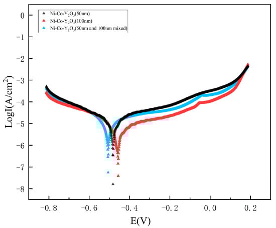 Figure 11 shows the polarization curves of the three coatings. Table 6 presents the parameters of the polarization curve. Table 7 is the statistical table of corrosion results. Among them, the corrosion current density of Ni-Co-Y2O3 (100 nm) coating is relatively low and lower than the other two, the corrosion rate is slow and the corrosion resistance is good. The corrosion potential of the coating is relatively positive, which means that the coating is less prone to oxidation reaction in the corrosion system. The corrosion current density of Ni-Co-Y2O3 (50 nm and100 nm mixed) coating is relatively high, and the corrosion potential is relatively negative, which means that the coating is more prone to oxidation in the corrosion system, in a more unstable state, and more susceptible to corrosion [37,38].